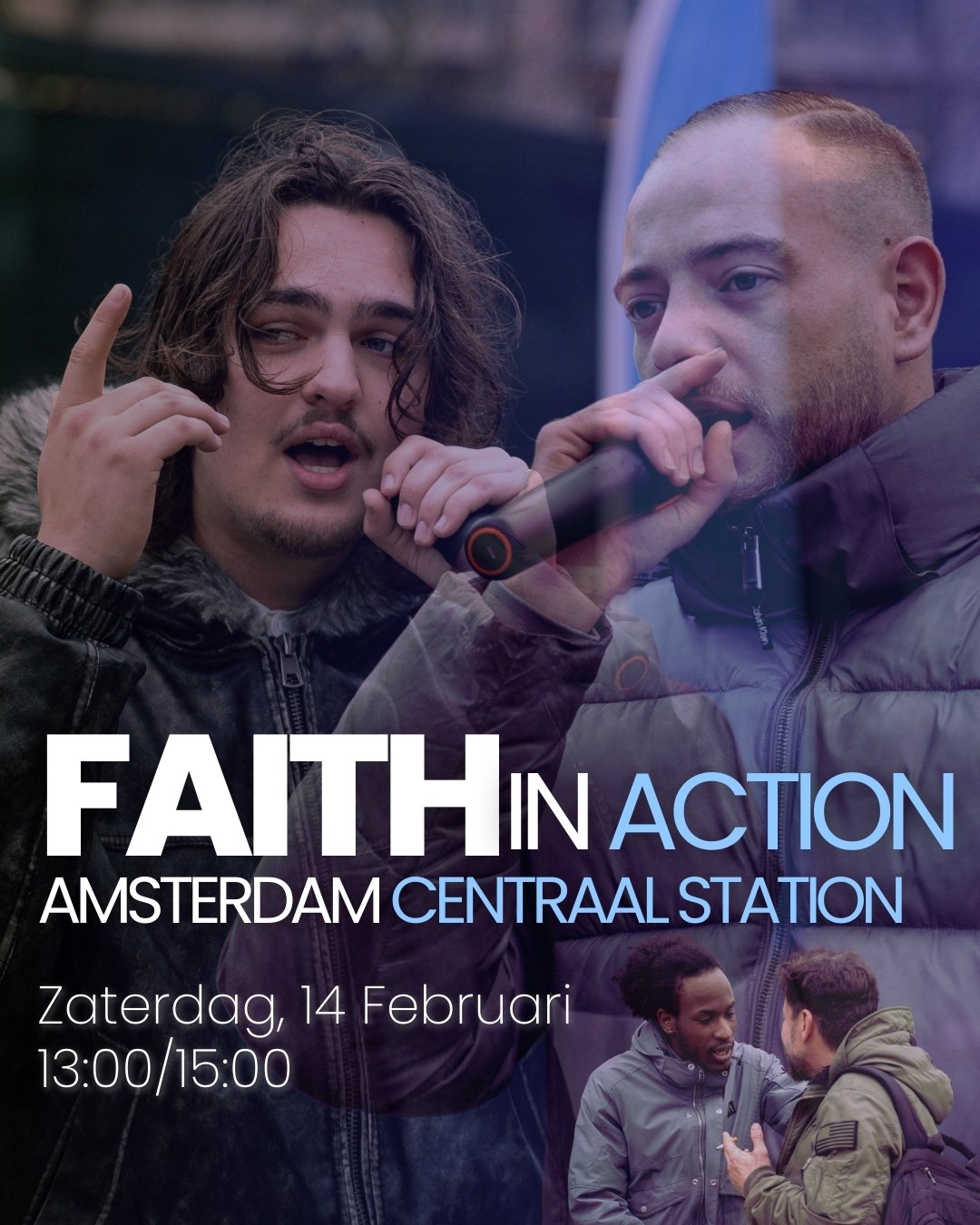 Wij zijn het team dat het evangelie brengt op straat tijdens hiphop events en getuigenmomenten. Faith in Action zal altijd plaatsvinden op een zaterdag van 13:00 tot 15:00 uur in verschillende steden in Nederland en daarbuiten. Opbouw is om 12:00 uur, daarna starten we gezamenlijk. Tijdens de muziek en getuigenissen staan evangelisten tussen de mensen om te bidden, te spreken en te delen over Jezus. Voorbidders staan rondom het terrein om geestelijk doorbraak te brengen.